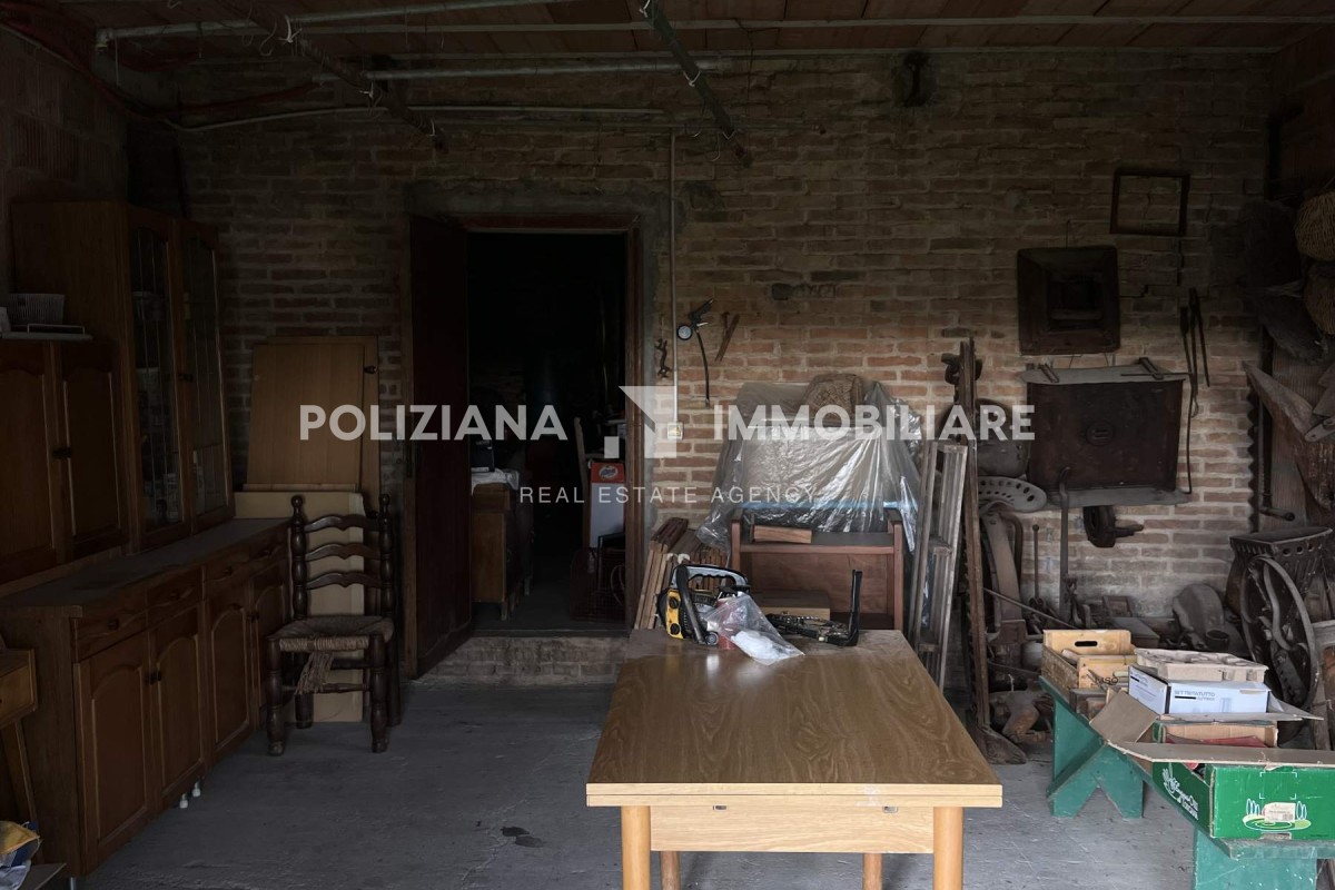 L’edificio principale, disposto su due livelli, si presenta in buone condizioni strutturali ed è caratterizzato da pareti in mattoni faccia a vista, travi in legno e copertura tradizionale in coppi. Al piano terra si trovano locali ad uso magazzino, cantina e garage, ideali anche per un futuro ampliamento residenziale o per creare una dependance indipendente.